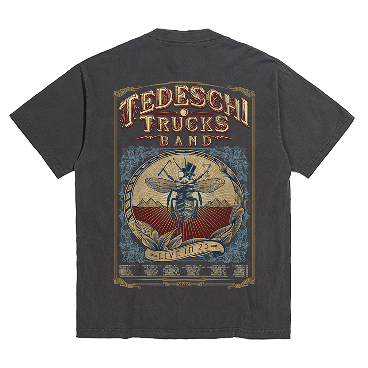 The Logo Tour Tee is a charcoal colored, garment dyed, 100% cotton T-shirt. There is a Tedeschi Trucks Band logo on the front left chest and a wonderful hand drawn illustration on the back with the LIVE IN 25 Tour stops.