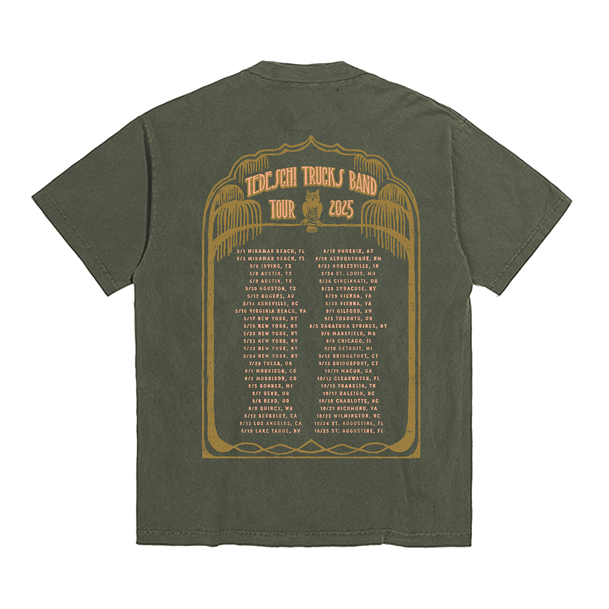 This Hemp colored, garment dyed, 100%  cotton T-shirt has a willow tree graphic on the front and the LIVE IN 25 Tour schedule on the back.